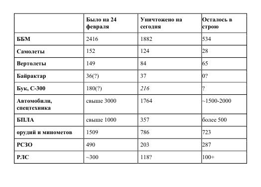 Всего с начала проведения специальной военной операции уничтожены: 124 самолета и 84 вертолета, 381 беспилотный летательный аппарат, 1882 танка и других боевых бронированных машин, 203 установки реактивных систем залпового огня, 786 орудий полевой артиллерии и минометов, а также 1764 единицы специальной военной автомобильной техники