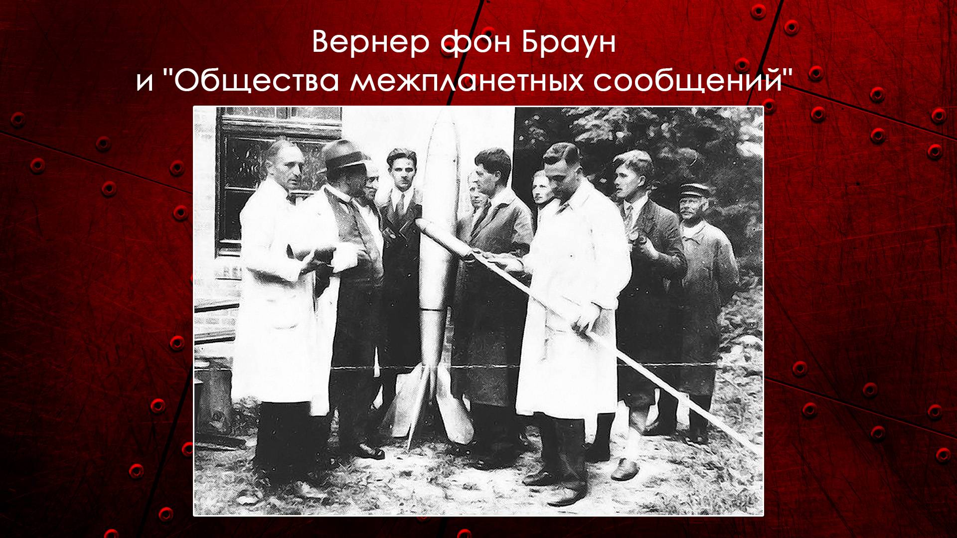 В 1928 году фон Браун познакомился с книгой «Ракета для межпланетного пространства» одного из основоположника современной ракетной техники Германа Оберта. Фактически Оберта можно назвать немецким Циолковским, он также закладывал теоретические основы полетов в космос. Известно, что Оберт и Циолковский были знакомы и даже какое-то время команда Оберта вела с ним переписку, которая оборвалась, когда к власти в Германии пришли нацисты, а часть бывших немецких ракетных романтиков стала с большим энтузиазмом строить боевые ракеты для нового Рейха.