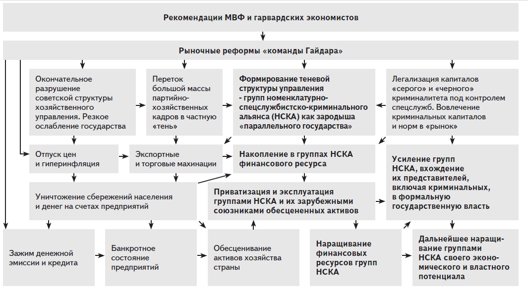 Так во второй половине 1990-х годов в России наши «либеральные реформаторы» фактически «достроили» тот новый властно-экономический строй, который журналисты назвали «олигархатом», а специалисты — криминальным капитализмом. Как его строили — я показываю на приведенной здесь схеме.