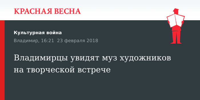Сразу после праздников в областном Доме работников искусств города Владимира пройдет творческая встреча с музами художников. Об этом 23 февраля сообщил сайт vladimir.mk.ru.