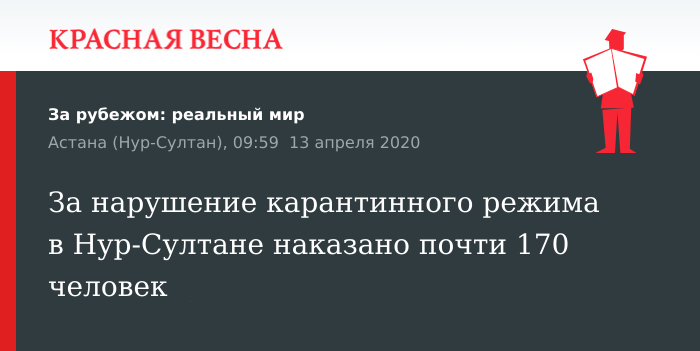 За нарушение правил карантина в столице Казахстана Нур-Султане наказано 169 человек. Об этом 12 апреля, ссылаясь на данные пресс-службы Департамента полиции города, сообщает Tengrinews.kz.