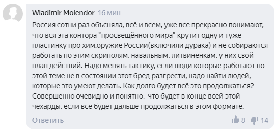 Российская делегация на открывшейся 25-й сессии Конференции государств-участников ОЗХО заявила, что подобное поведение противоречит правилам ОЗХО. Представители РФ напомнили, что члены упомянутой международной организации обязаны прояснять все возникшие вопросы с помощью обмена информации и проведения консультаций.