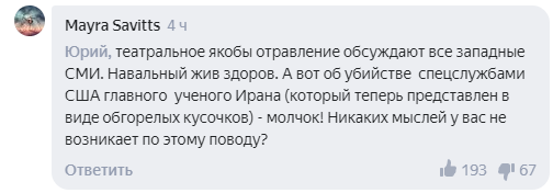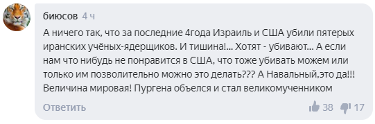 Запад уделяет гораздо больше внимания выдуманному отравлению Алексея Навального, чем реальному убийству иранского физика-ядерщика Мохсена Фахризаде, считают пользователи Сети. 30 ноября их комментарии опубликованы новостным агрегатором «Яндекс.Новости».