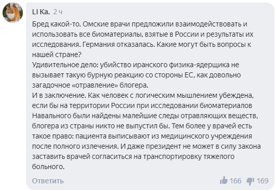 Комментаторы считают, что позиция Запада противоречит здравому смыслу. Если бы Навальный был отравлен российским властями, то его бы не выпустили на лечение за границу.