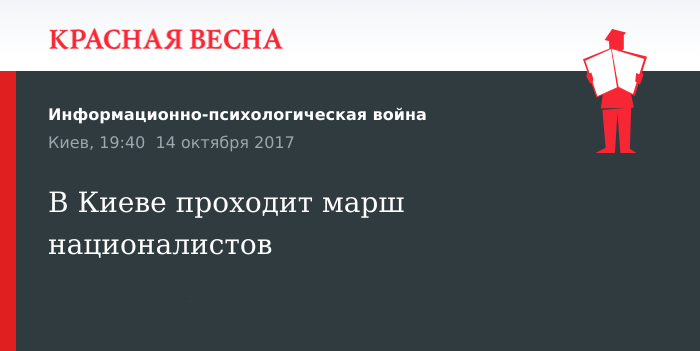 Националисты вышли под флагами организаций «Правый сектор» (организация, деятельность которой запрещена в РФ), ВО «Свобода» и «Национальный корпус». Звучат лозунги: «Слава нации — смерть врагам», «Украина понад усе». Марш сопровождается конным отрядом полиции спереди и полицейскими по бокам.