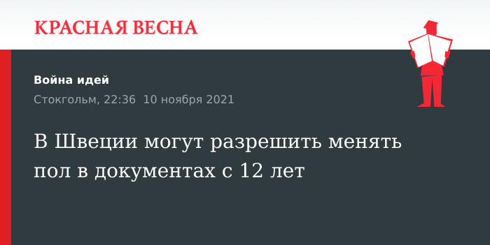 Изменение пола в документах станет доступно шведским детям начиная с 12 лет. С таким предложением выступило правительство Шведского королевства, 10 ноября сообщает ИА REGNUM.