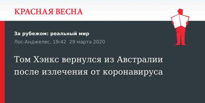 Голливудский актер Том Хэнкс вместе с женой излечились от коронавируса и вернулись из Австралии домой в США. Об этом актер сообщил 28 марта в своем микроблоге Twiter.