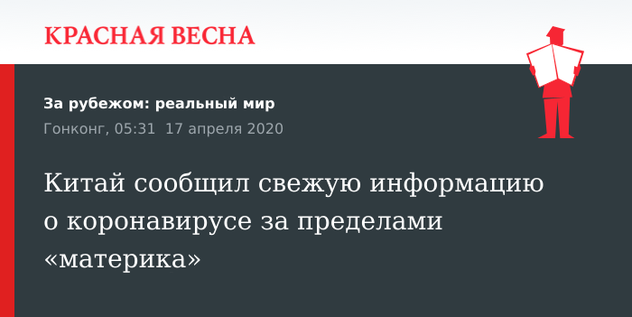 Свежими данными о заболеваемости новым коронавирусом за пределами материковой части страны поделились власти Китая, сообщает 17 апреля агентство Синьхуа.