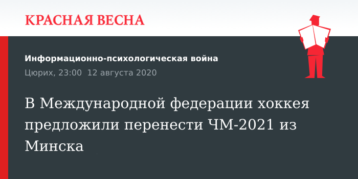 Вопрос возможного переноса чемпионата мира по хоккею 2021 года из Белоруссии в другую страну поднял вице-президент Международной федерации хоккея (ИИХФ) Калерво Куммола 11 августа, сообщает белорусский портал «Прессбол».