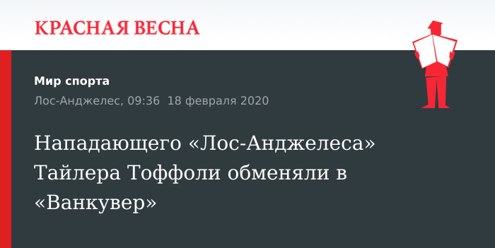 Хоккейный клуб «Лос-Анджелес Кингз» обменял нападающего Тайлера Тоффоли в «Ванкувер Кэнакс», 18 февраля сообщает пресс-служба НХЛ.