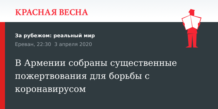 Напомним, на данный момент в Армении зафиксировано 736 случаев заражения коронавирусом. Для противодействия распространению эпидемии в стране введен режим чрезвычайного положения. Отменены все массовые мероприятия, закрыты учебные заведения, граждан настоятельно просят оставаться дома.
