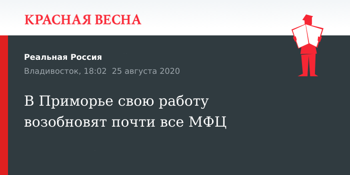 «С 1 сентября в Находке пункт МФЦ на Школьной, 18, будет принимать граждан по предварительной записи. А офис в Уссурийске по улице Пушкина, 4 начнет работать сразу без ограничений для всех посетителей. Единственным закрытым для заявителей МФЦ останется центр „Мои документы“, расположенный во Владивостоке на улице Борисенко, 102. Дата его открытия пока не определена», — сообщил директор МФЦ Приморского края Сергей Александров.
