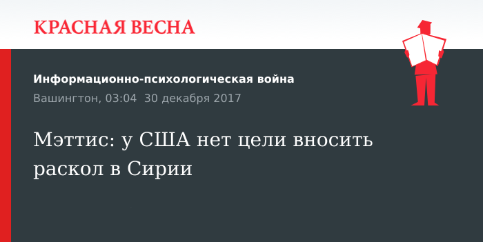В пятницу, 30 декабря, выступая на пресс-конференции, глава Пентагона заявил, что США не ставят перед собой задачу использовать «демаркационную линию» для раздела Сирии. Также он заявил о намерении увеличить активность США в регионах Сирии, которые освобождены от террористов, но пока не контролируются сирийскими властями.