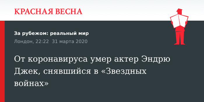 От коронавируса в возрасте 76 лет скончался британский актер Эндрю Джек, сыгравший майора Калуана в «Звездных войнах». Об этом заявил агент актера Джилл Маккалоу, сообщает 31 марта издание Evening Standard.