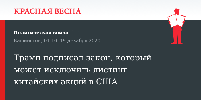 Закон, который может исключить китайские компании с бирж США, подписал президент США Дональд Трамп 18 декабря, передает Bloomberg.