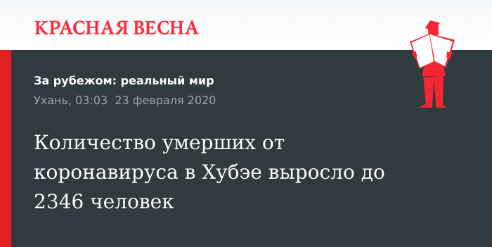 Вспышка коронавируса COVID-19 стала причиной смерти уже 2346 человек в китайской провинции Хубэй, 23 февраля сообщает региональный комитет по вопросам гигиены и здравоохранения.