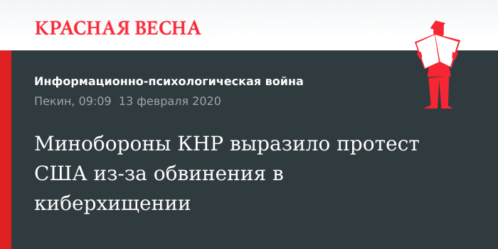 Протест США в связи с их обвинениями в адрес четырех жителей Китая выразили в Министерстве обороны КНР 13 февраля, сообщает пресс-служба военного ведомства.