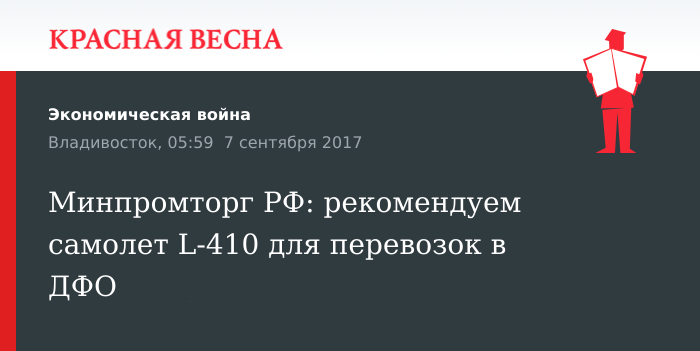 О рекомендации Министерства промышленности и торговли РФ использовать чешский самолет L-410 для внутренних перевозок между регионами Дальнего Востока заявил замдиректора департамента авиационной промышленности ведомства Михаил Богатырев сегодня, 7 сентября, во время заседания «Развитие воздушных перевозок на Дальнем Востоке. Что дальше?» Восточного экономического форума, передает ТАСС.