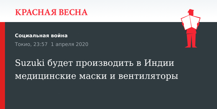 Вентиляторы для медучреждений и защитные маски для лица начнет производить в Индии японский автопроизводитель Suzuki Motor. Об этом компания заявила 1 апреля, сообщает Nikkei Asian Rewiev.