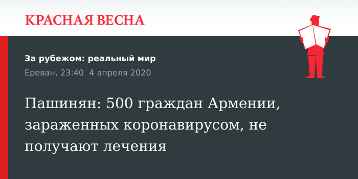 Пашинян привел мировую статистику, в соответствии с которой в мире на данный момент зафиксировано более 1,1 миллиона инфицированных коронавирусом. Более 59 тысяч человек умерли, более 229 тысяч сумели исцелиться. При этом в Армении, по его словам, зафиксировано 770 случаев заражения, при этом 500 из них никакого лечения не получают: