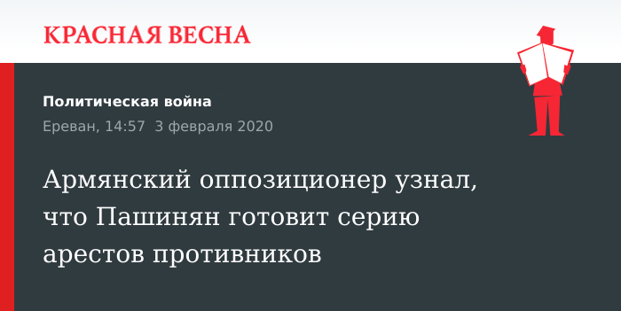 Серию арестов своих политических противников распорядился провести премьер-министр Армении Никол Пашинян, заявил председатель армянской общественной организации «Гражданское сознание», редактор сайта Antifake Нарек Самсонян 3 февраля на своей странице в Facebook.