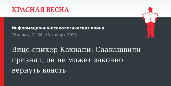 Экс-президент Грузии Михаил Саакашвили своим заявлением фактически признал, что не может вернуться к власти в стране законным способом. Данное мнение высказал вице-спикер парламента Грузии Георгий Кахиани 13 января перед журналистами, сообщает IPN.