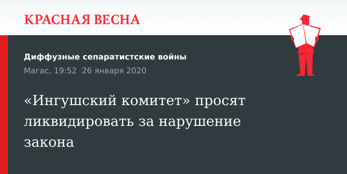 Иск с просьбой ликвидировать общественное движение «Ингушский комитет национального единства» (ИКНЕ) поступил от прокуратуры Ингушетии в верховный суд республики. Об этом 26 января сообщает «Коммерсантъ».