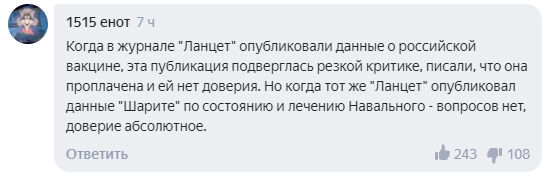 Пользователи Сети прокомментировали статью в медицинском журнале Lancet, в которой врачи немецкой клиники «Шарите» описали ход лечения Навального с момента его доставки в больницу Омска, до его госпитализации в Германии. Медики не сообщают, какие конкретно препараты применялись для лечения пациента в России, но упоминают, что в Германии Навального лечили атропином и препаратом обидоксим.