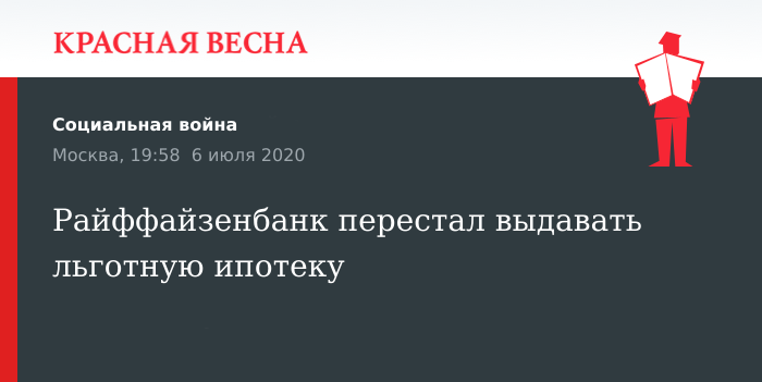 Прием заявлений на получение ипотечных кредитов с льготной ставкой 6,19% по программе «Ипотека с господдержкой 2020», прекратил с 6 июля Райффайзенбанк, 6 июля сообщает пресс-служба банка.