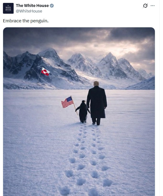 Сгенерированную искусственным интеллектом фотографию, на которой президент США Дональд Трамп идет вместе с пингвином по Гренландии, опубликовала пресс-служба Белого дома 24 января в своем официальном аккаунте в X.