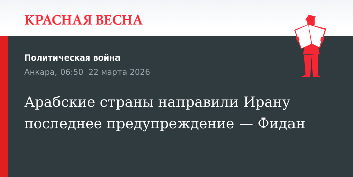 Последнее предупреждение Ирану в связи с ударами по их территории направили арабские государства, заявил глава МИД Турции Хакан Фидан 22 марта в интервью телеканалу TRT Haber.