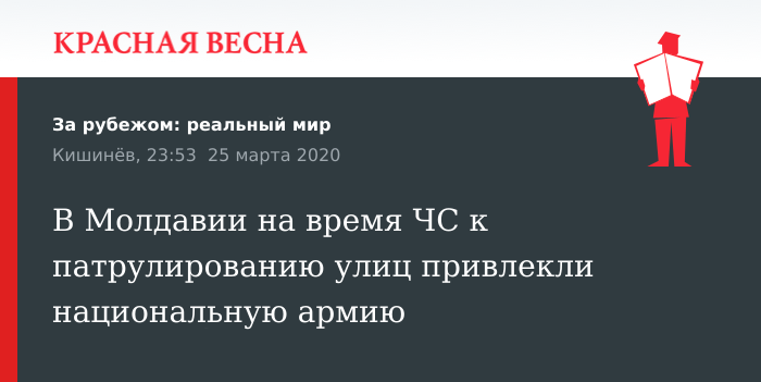Военнослужащие национальной армии Молдавии совместно с полицией приступили к патрулированию улиц молдавских городов с целью защиты населения в период эпидемии коронавирусной инфекции, сообщил президент страны Игорь Додон 25 марта на своей официальной странице в Facebook.