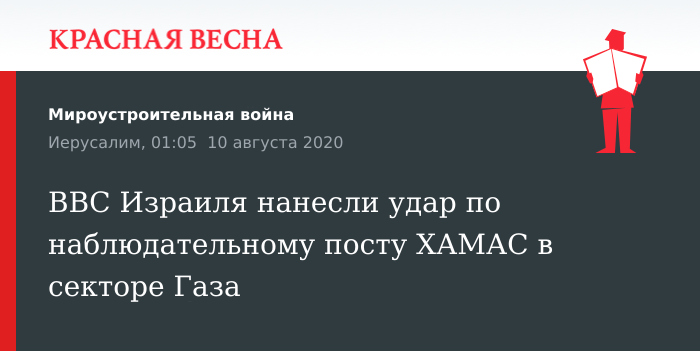 Авиаудар по наблюдательному посту палестинского исламистского движения ХАМАС в секторе Газа, ставший ответом на атаку Израиля воздушными шарами со взрывчаткой, нанесла Армии обороны Израиля, 9 августа сообщает пресс-служба ЦАХАЛа.