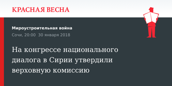 Напомним, что конгресс начал свою работу в городе Сочи 29 января. Официальное открытие мероприятия состоялось сегодня, 30 января. Участие в конгрессе приняли более полутора тысяч человек, представляющих различные политические, этнические и религиозные группы Сирии. На открытии форума присутствовали министр иностранных дел РФ Сергей Лавров и спецпосланник генсека ООН по Сирии Стаффан де Мистура.