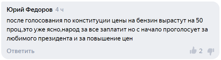 Ряд пользователей связали динамику цен на бензин с готовящимися поправками в Основной закон РФ, голосование по которым намечено на 1 июля 2020 года. Так, Кактус S саркастически назвал рекордную стоимость Аи-95 подарком «ко Дню Конституции», а Саня холод предложил «прозаседавшимся» депутатам «прописать в конституции новую поправку о бензине». А вот Юрию Федорову явно не до смеха: