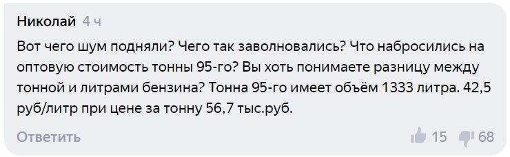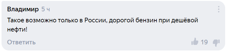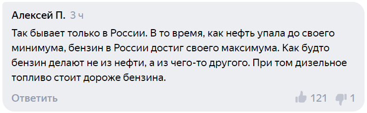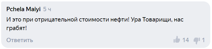 Особо болезненно на реакции некоторых комментариев сказались впечатления от апреля месяца, когда нефть торговалась на бирже по отрицательной цене. В частности, пользователь Pchela Maiyi сопоставила эти совсем недавние котировки с теперешней рекордной ценой на бензин: