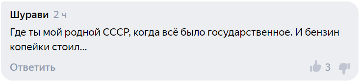 В комментариях отметилось немало сторонников СССР, которые относят подорожание бензина на счет капитализма, при котором средства производства принадлежат олигархам или в лучшем случае, госкорпорациям. В частности, по Советскому Союзу, где цена бензина не зависела от биржевой коньюнктуры, ностальгирует пользователь Шурави: