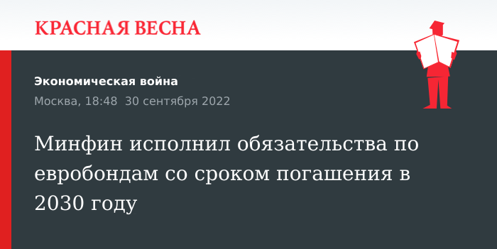Министерство финансов России выполнило все обязательства на сумму $319,3 млн в рублях по еврооблигациям со сроком погашения в 2030 году. Об этом 30 сентября сообщается на сайте финансового ведомства РФ.