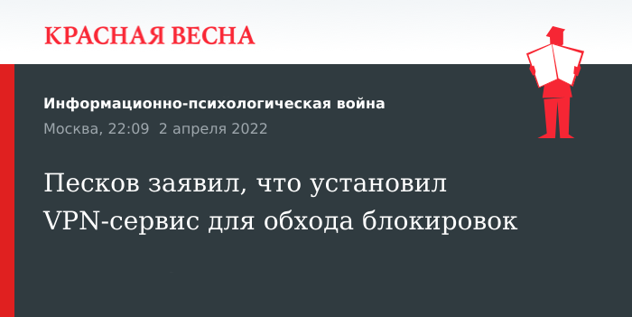 VPN-сервис для доступа к заблокированным в России сайтам установил пресс-секретарь президента РФ Дмитрий Песков. Об этом он заявил 2 апреля в интервью телеканалу «Беларусь1».