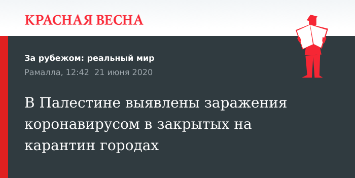Ранее власти Палестины приняли решение о закрытии на карантин Хеврона и Наблуса из-за вспышки коронавирусной инфекции. Город Наблус будет закрыт до 20:00 (совпадает с мск) 22 июня для изучения эпидемиологической обстановки. Въезд и выезд в Хеврон ограничен до 25 июня.