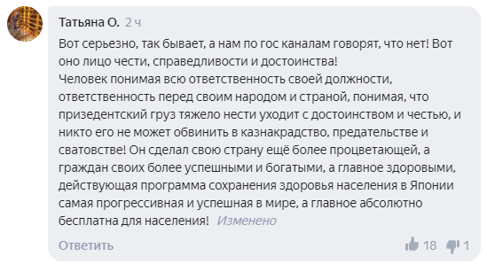 Добровольная отставка премьер-министра Японии Синдзо Абэ, оставившего свой пост из-за болезни, является примером чести и достоинства, считают пользователи Сети. 28 августа их комментарии опубликованы новостным агрегатором «Яндекс.Новости».