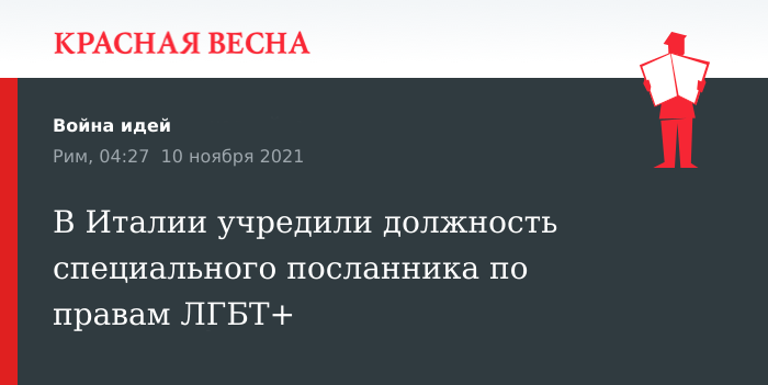 Напомним, из-за разногласий разных политических партий закон, направленный на защиту прав ЛГБТ+, до сих пор не принят. Законопроект, подготовленный членом Палаты депутатов Италии и активистом движения ЛГБТ Алессандро Дзаном, так называемый «закон Дзана», предполагает ужесточение наказания за проявление нетерпимости и насилия на расовой, этнической и гомофобской почве.