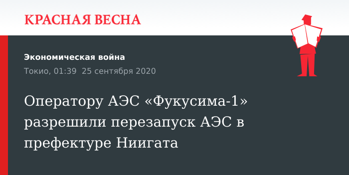 Разрешение на возобновление деятельности АЭС в префектуре Ниигата получила от японского Управления по ядерному регулированию (NRA) компания Tokyo Electric Power (TEPCO) 23 сентября, сообщает издание The Asahi Shimbun.