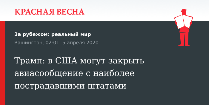 Авиасообщение с наиболее пострадавшими от коронавирусной инфекции районами США может быть закрыто, заявил президент США Дональд Трамп 4 апреля на брифинге в Белом доме.