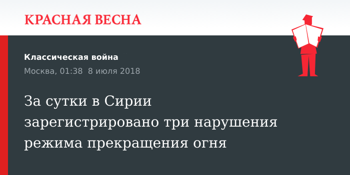 Три случая нарушения режима прекращения огня за прошедшие сутки в провинциях Латакия и Алеппо зафиксировано в Сирии российскими представителями комиссии по перемирию 7 июля, сообщает сайт Минобороны РФ.