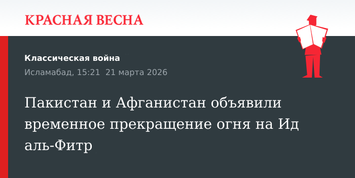 Решение о временном прекращении огня приняли Пакистан и Афганистан в преддверии приближающегося праздника Ид аль-Фитр Пакистан, 18 марта сообщает пакистанский портал Dawn.