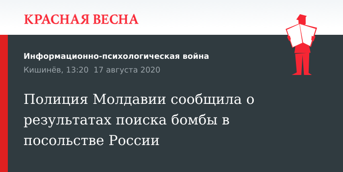 Напомним, в Молдавии регулярно «минируют» посольство России. В июне этого года полиция Молдавии завела уголовное дело за ложное сообщение о минировании российского посольства.