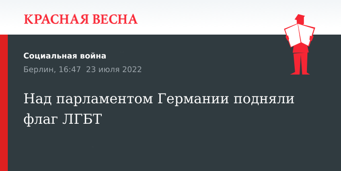 Над бундестагом в Берлине впервые подняли флаг ЛГБТ, 23 июля сообщила газета Berliner Zeitung.