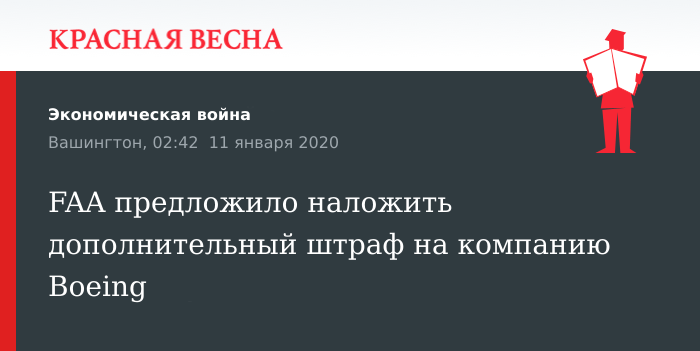 Штраф в размере $5,4 млн за предполагаемую установку несоответствующих деталей на 178 самолетах Boeing 737 MAX предложило назначить компании Boeing Федеральное управление гражданской авиации США (FAA), 10 января сообщает пресс-служба управления.