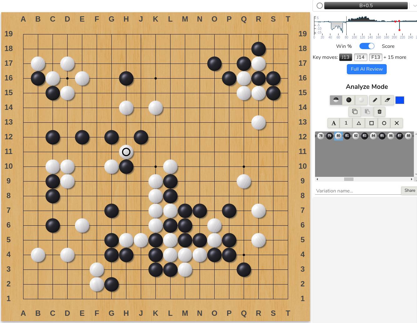 Игра состоялась на сервере OGS в закрытом режиме. Матч шел на равных, игровые алгоритмы показывают небольшой перевес черных после 80 хода.